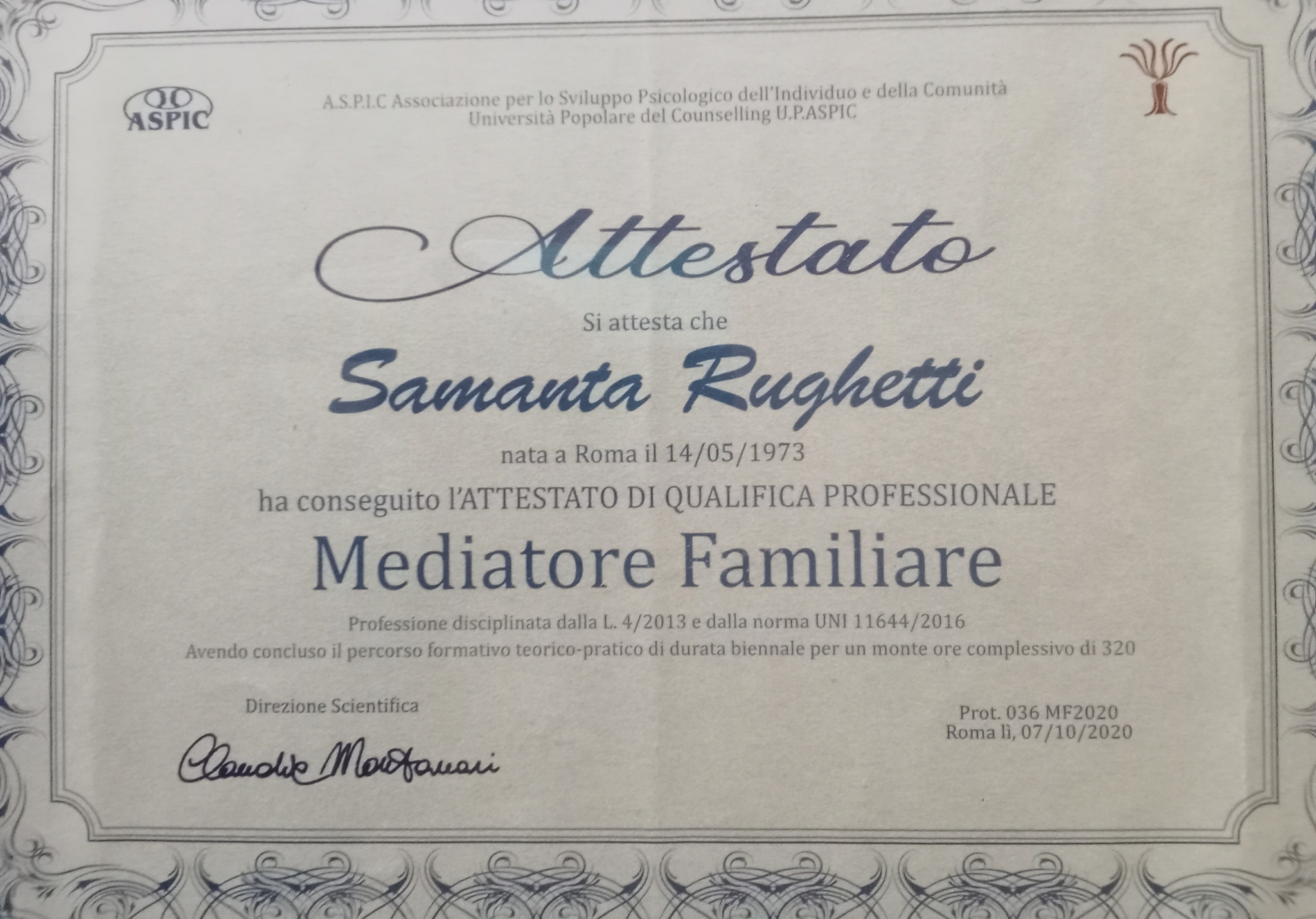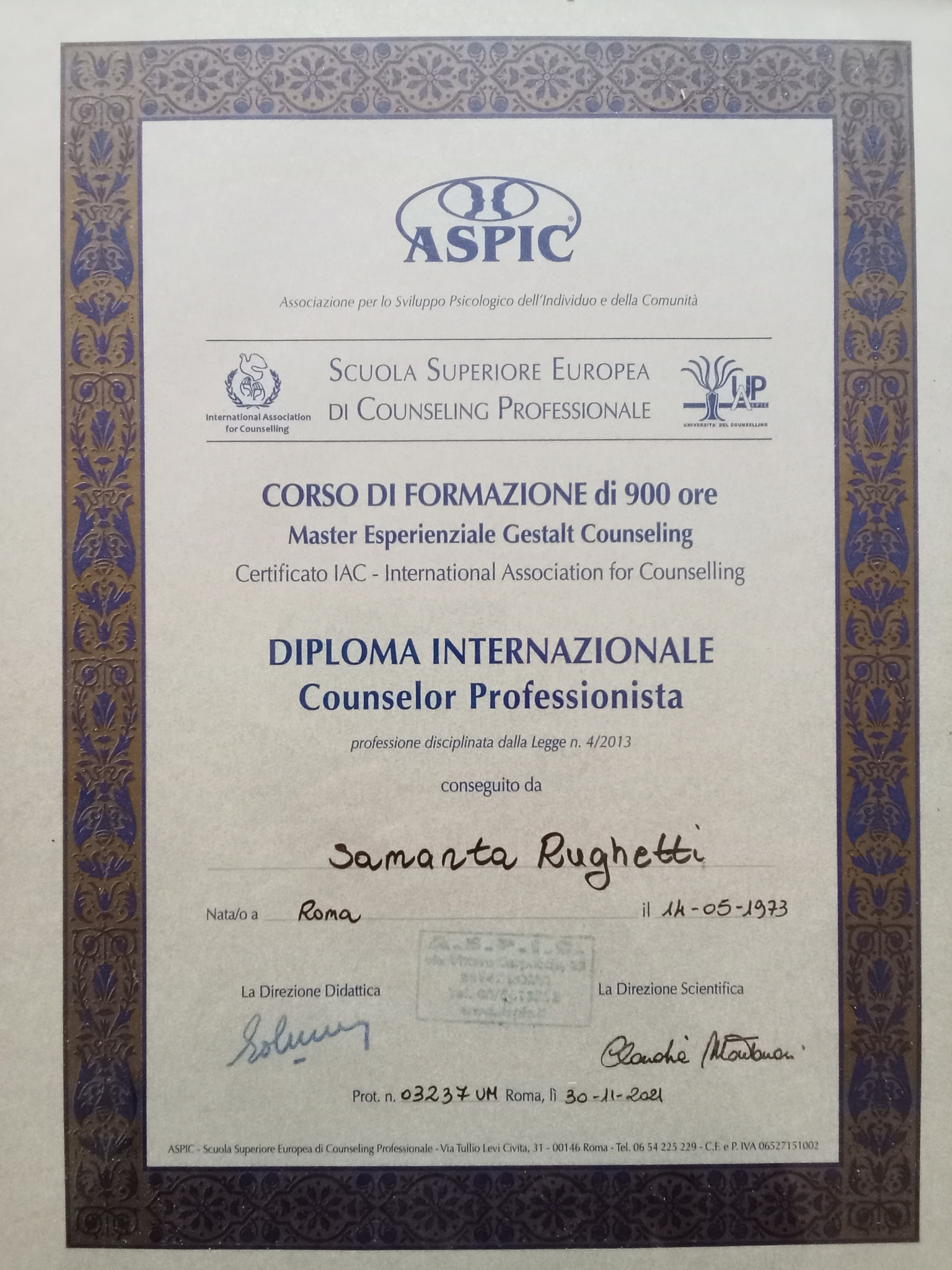 Il mio percorso di Counseling è nato da una ricerca personale per dare spiegazione a esperienze di sofferenza, per conoscere chi ero veramente e per poter diventare la migliore versione di me stessa, fino ad arrivare a sentire che poteva essere messo a disposizione di altre persone. Ho una formazione di 900 ore e un diploma internazionale di counselor professionista: Master Esperienziale Gestalt Counseling. Mi sto inoltre specializzando nell'Assistenza Spirituale d'accompagnamento alla morte.